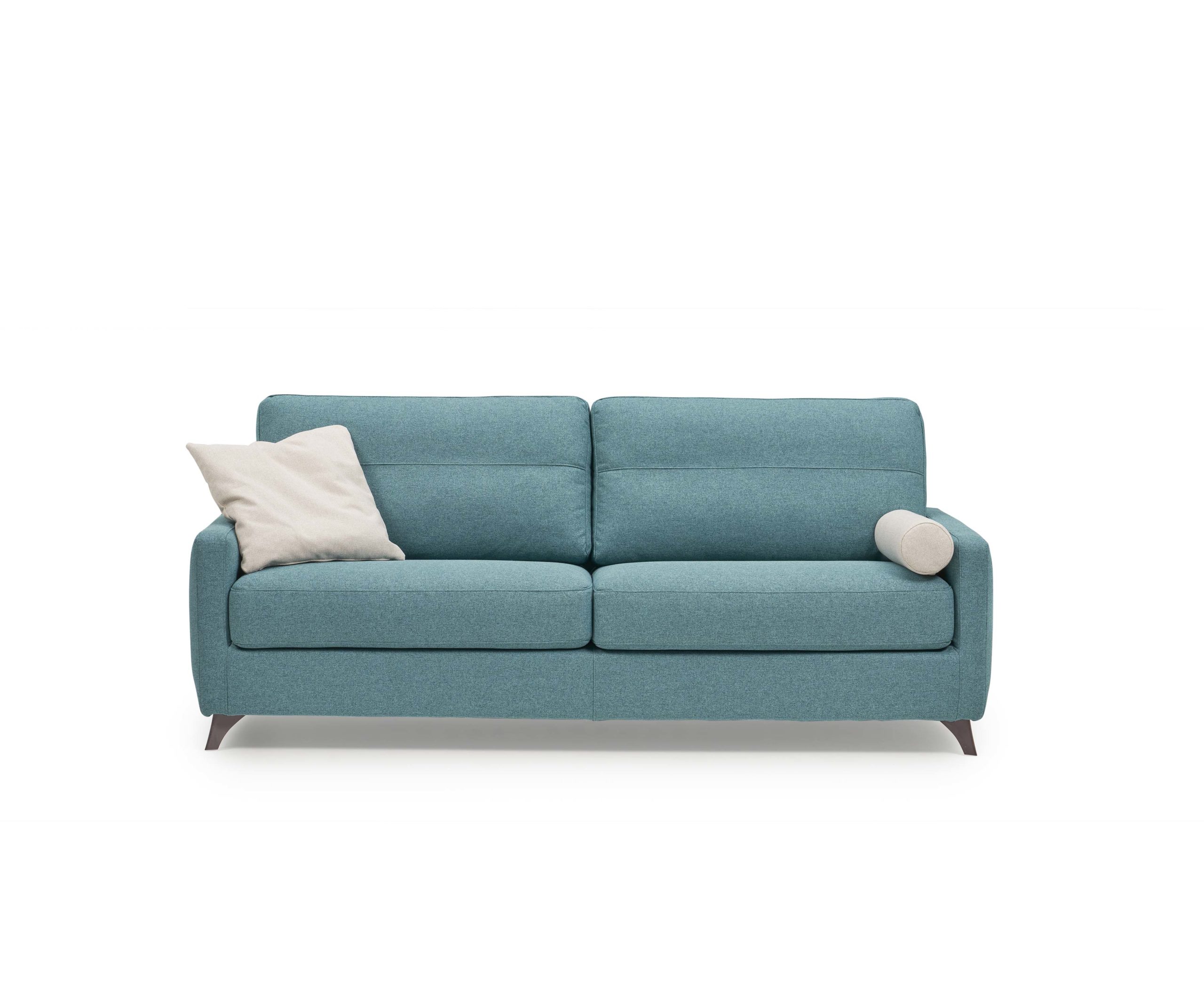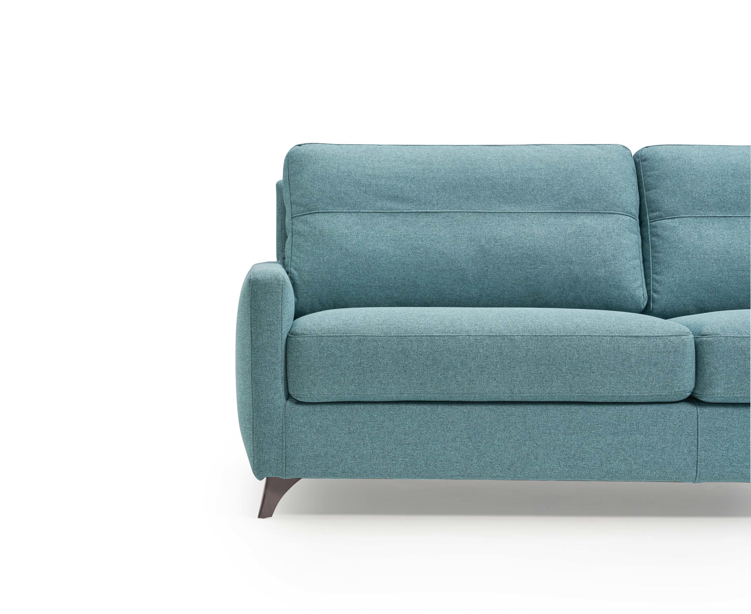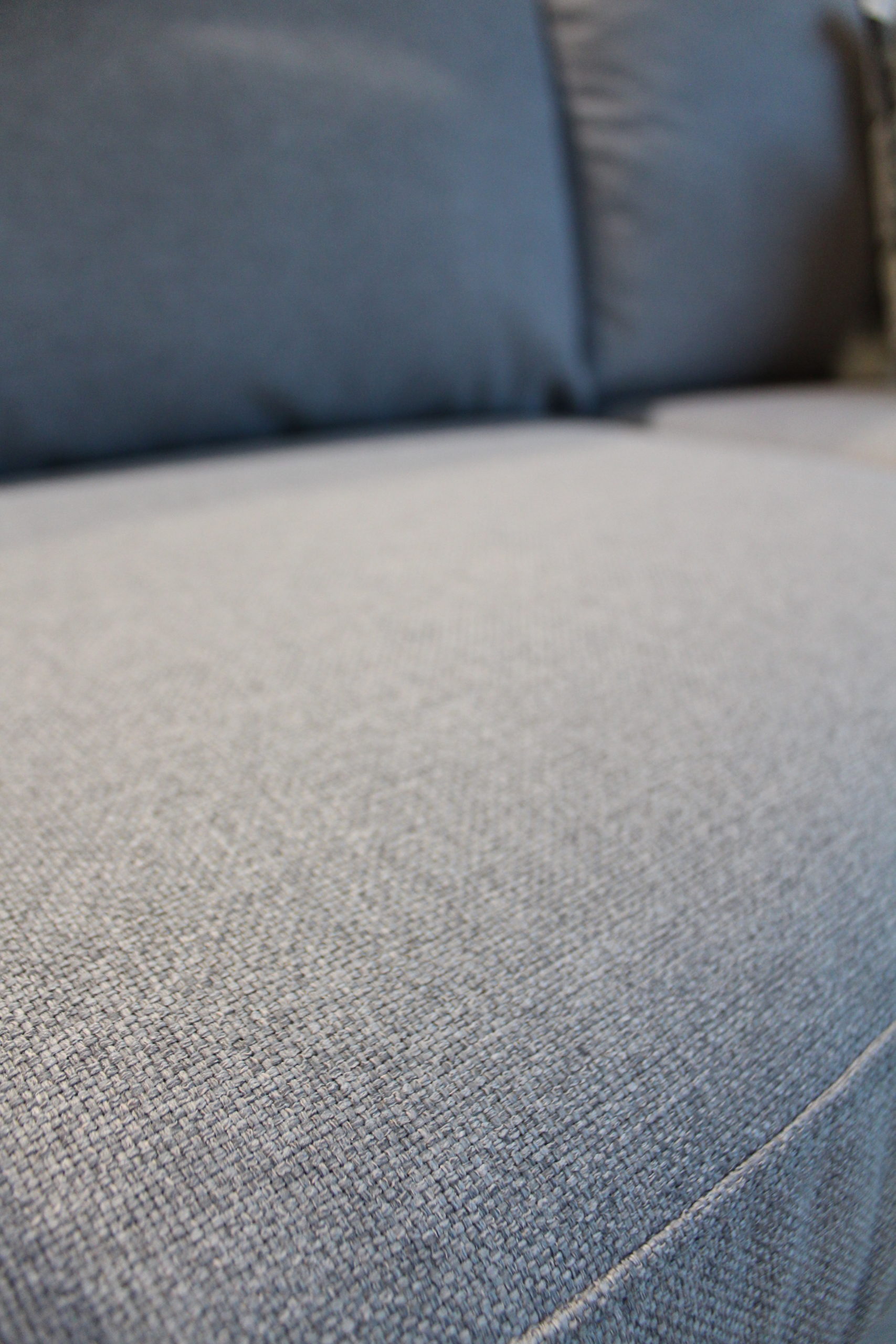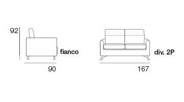 Struttura in legno di abete e truciolare con imbottitura in poliuretano, rivestita in tessuto protettivo accoppiato. Molleggio realizzato con nastri elastici. Cuscini di seduta in poliuretano espanso con fibra acrilica, cuscini di schienale in fiocchi di fibra. I cuscini di schienale sono reversibili con uno dei due lati con una cucitura nella parte frontale e l’altro senza. Piede di serie in metallo color caffè h.11 cm.