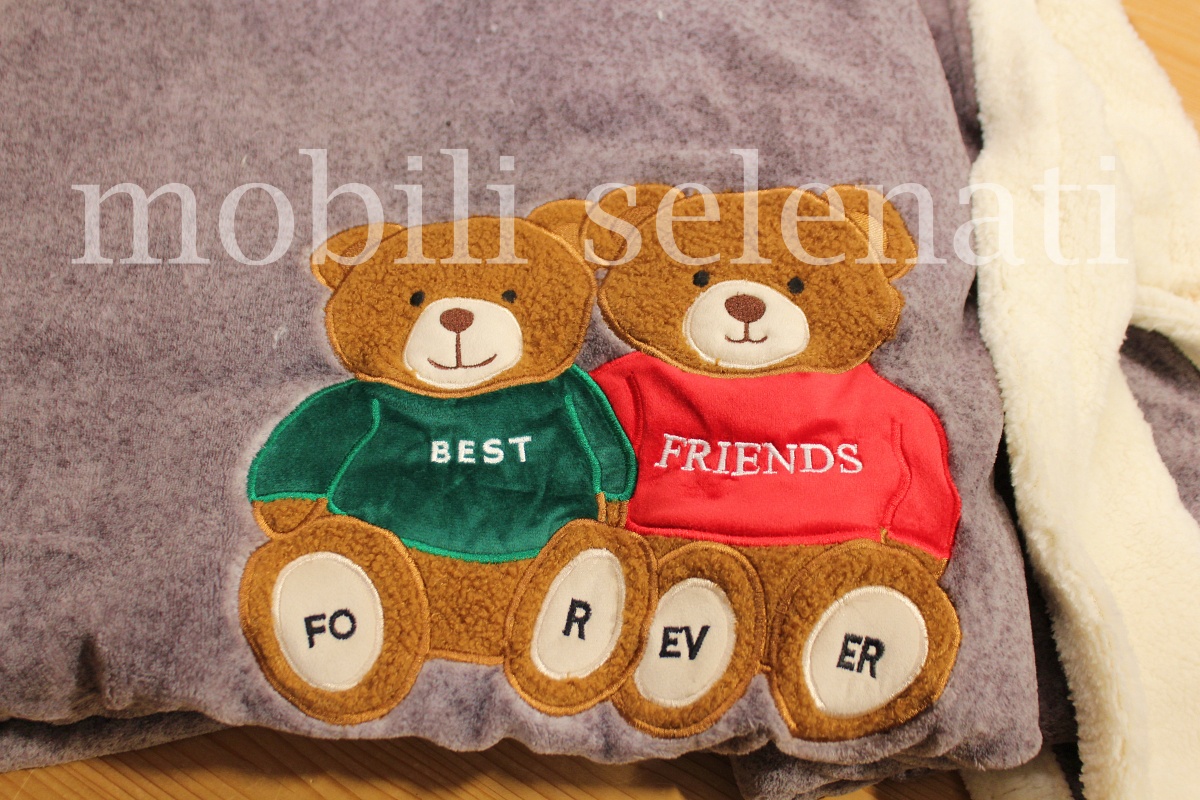 I plaid morbidotto Friends, realizzati in micropile, sono caldi, leggeri e “morbidosi”. Impreziositi da un orlo a risvolto che rifinisce tutto il perimetro , hanno un doppio strato. Il lato superiore arricchito da un’applicazione ricamata mentre il lato inferiore (retro) è un soffice agnellato sherpa. Misura: plaid 130×160 cm.